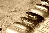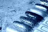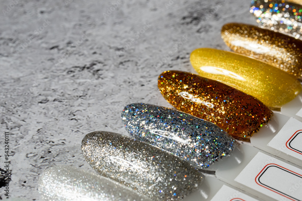Samples of nail polish in different bright colors with sequins. Colorful manicure samples with nail polish. Top view of the palette of gel lacquers for nail art.