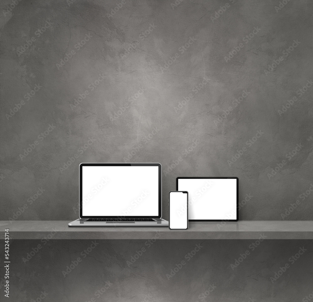 Laptop, mobile phone and digital tablet pc on grey wall shelf. Square background