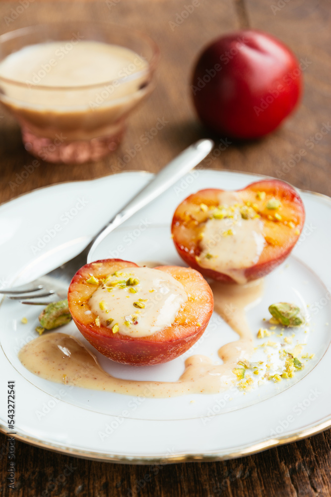 Grilled Plums with Maple Cinnamon Soy Yogurt and Pistachios