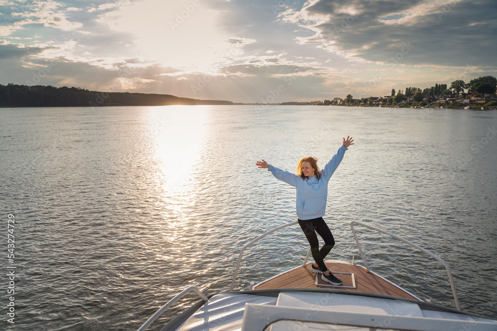 Happy adult young caucasian woman on a yacht with arms raised up during a river trip at sunset