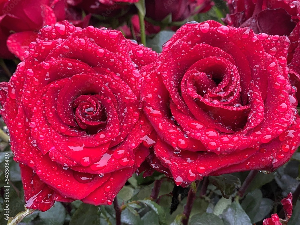 Two red rose with water drops.