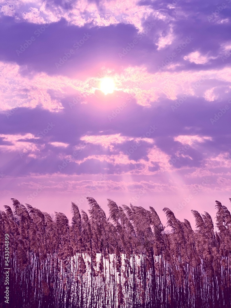 Sunset over the reed lake at evening.