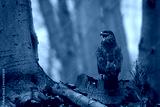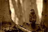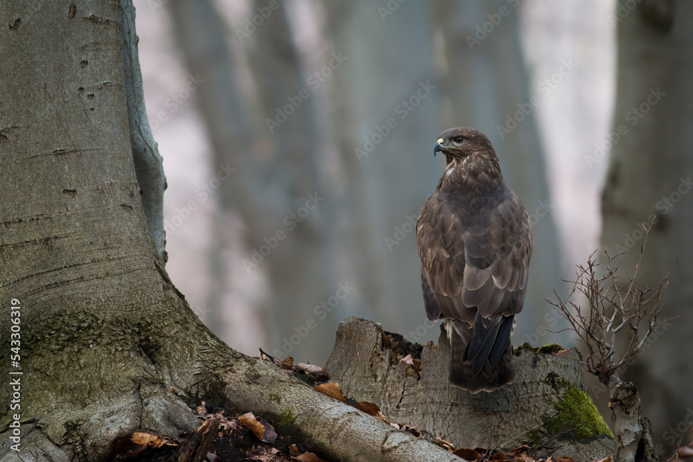 Common buzzard, buteo buteo, sitting on stump in forest in autumn. Bird of prey observing in woodland form back. Brown majestic animal looking on tree in fall.
