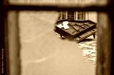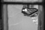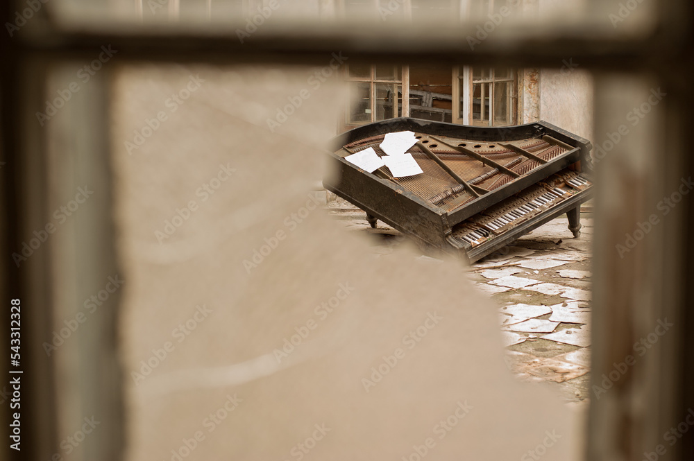 Porzucone stare pianino widziane przez rozbitą szybę.