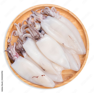 Fresh Splendid Squid on wooden plate isolated on white background, Fresh Squid in wooden plate on white, with work path.