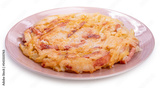 Potato and Bacon Korean pancake or Pajeon in pink plate isolated on white background, Pajeon Potato and Bacon on white background with work path.