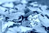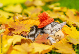 Cute kitten wearing warm hat hugs favorite toy bear and sleeps on green summer grass under autumn leaf