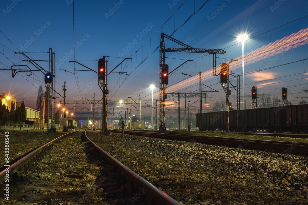 Railway station in the evening scenery. Railroad tracks at Kielce Herby station, Poland.