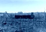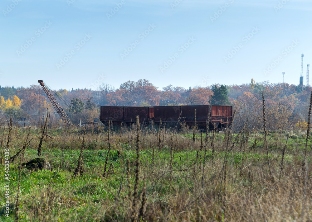 old abandoned rusty wagons of a freight train in a field in autumn in the countryside