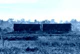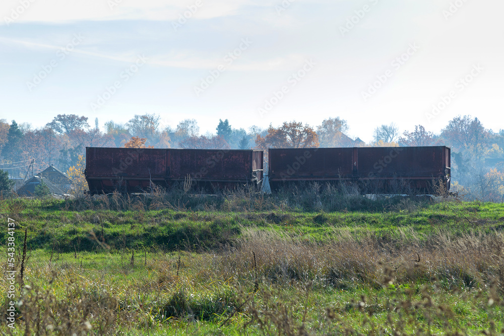 old abandoned rusty wagons of a freight train in a field in autumn in the countryside