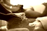 Spa, wellness massage and relax couple at luxury beauty salon for body healthcare, facial treatment or stress relief. Zen peace, calm mindset or chakra energy healing for black woman, man or customer