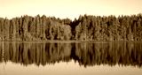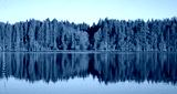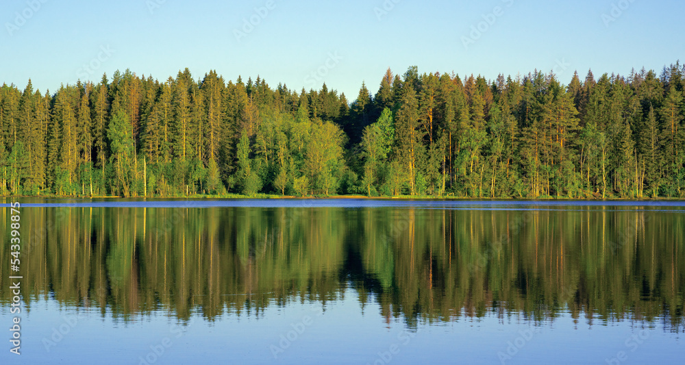 Green trees on the shore of a blue lake in the form of a banner.Rest on the river. Summer fishing. A clean pond, trees are reflected in the water.