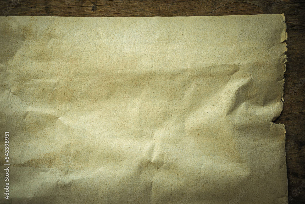 The texture of beige old paper on a wooden table.Ancient parchment background for the text. Background of the pirate map. The background is old.