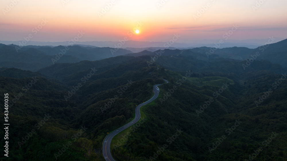 andscape shadow of valley and thin mist caused by light of sunset in evening and Road No.1081 also hnow as Sky Road, winding along ridge between Pua Distric, Nan Province, is beautiful route north
