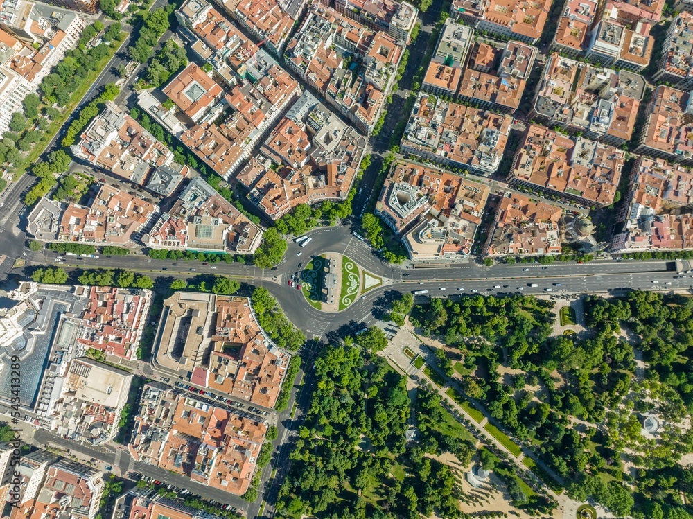 Aerial shot of Madrid streets symmetrically divided into residential areas and park areas