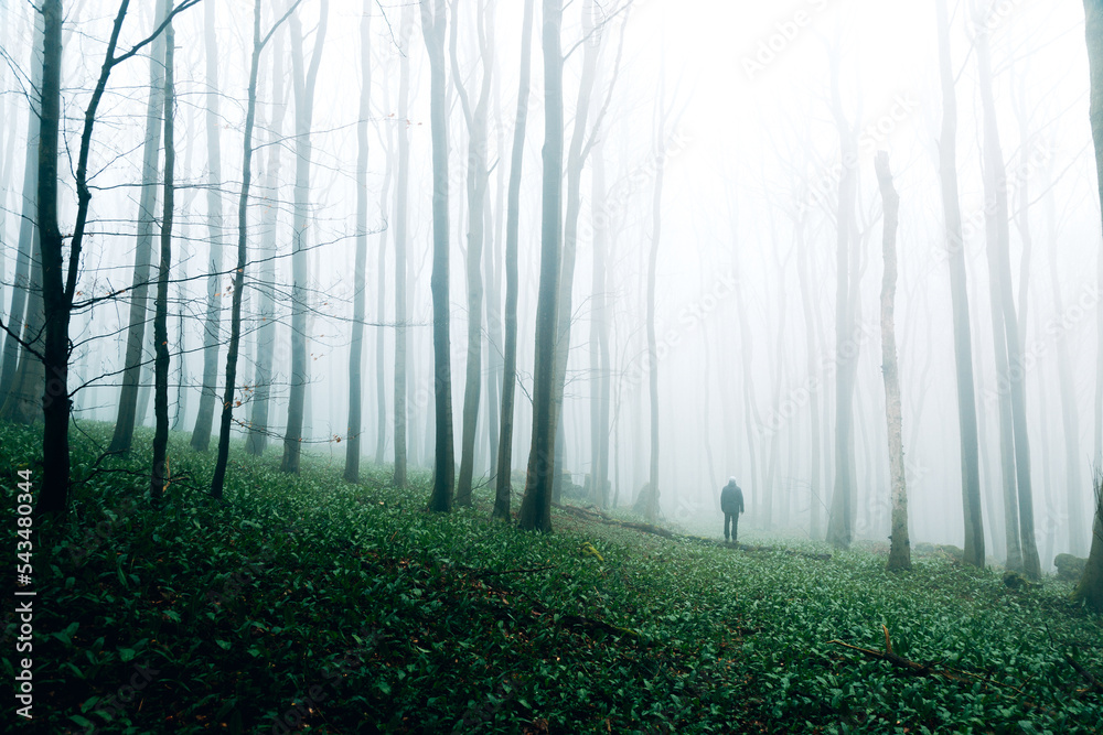 Eine Person läuft durch den nebligen Wald
