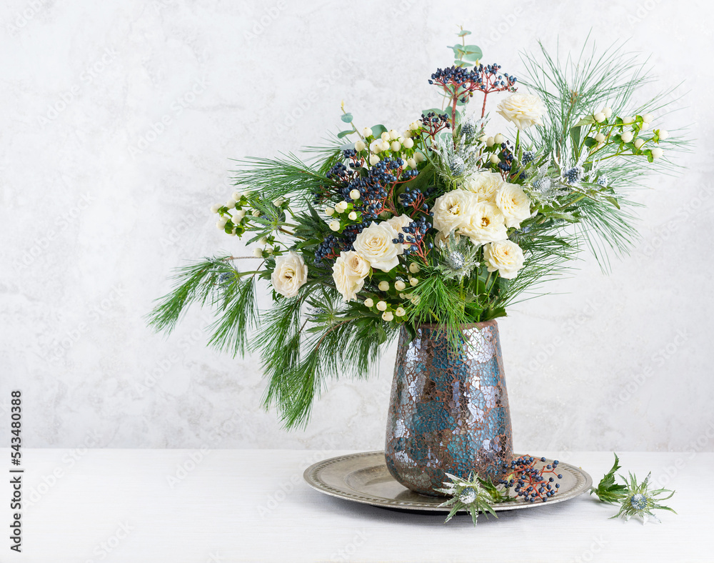 Beautiful winter bouquet in vase. Flower arrangement with roses, fir branches, winter berries, eucalyptus and eryngium. Christmas flower decoration.