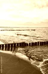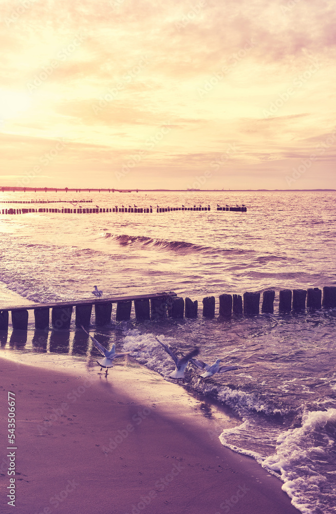 Wooden breakwater at a beach at sunset, selective focus, color toning applied.