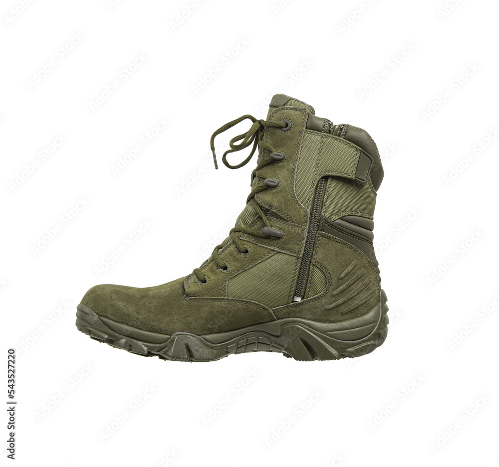 Modern army combat boots. NNew khaki shoes. Isolate on a white back.