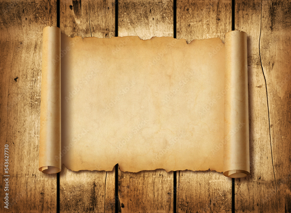 Old mediaeval paper sheet. Horizontal parchment scroll on a wood board
