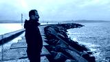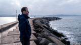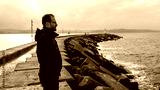 Lonely man watching open sea in harbor, thoughtful gaze, dark clouds and sea, winter weather, image with text space
