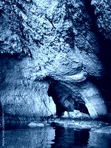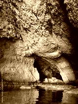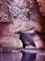 Cave with surreal rocks and reflections in sea water.
