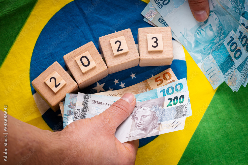 The year 2023 against the backdrop of the Brazilian flag, hands full of money, Concept, Brazil's economic prospects in 2023, Economic growth and hope for changes in the country