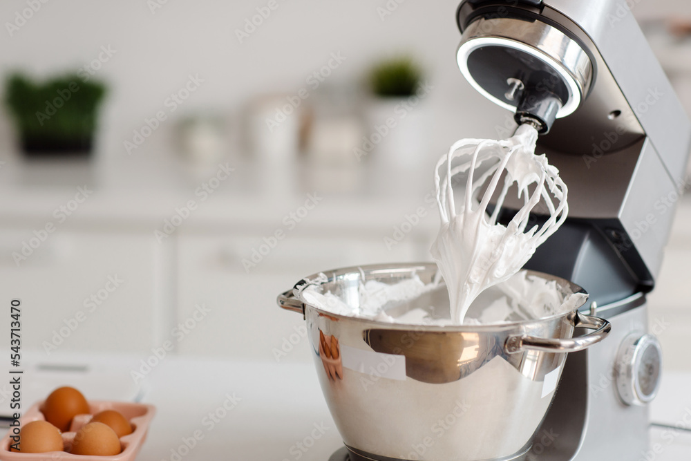On the table is a mixer with white meringue cream inside. Homemade sweets. High quality photo