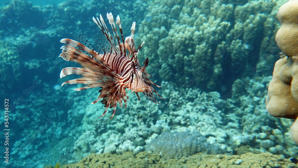 Lion Fish in the Red Sea in clear blue water hunting for food .