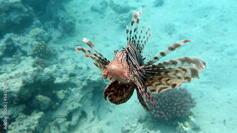 Lion Fish in the Red Sea in clear blue water hunting for food .
