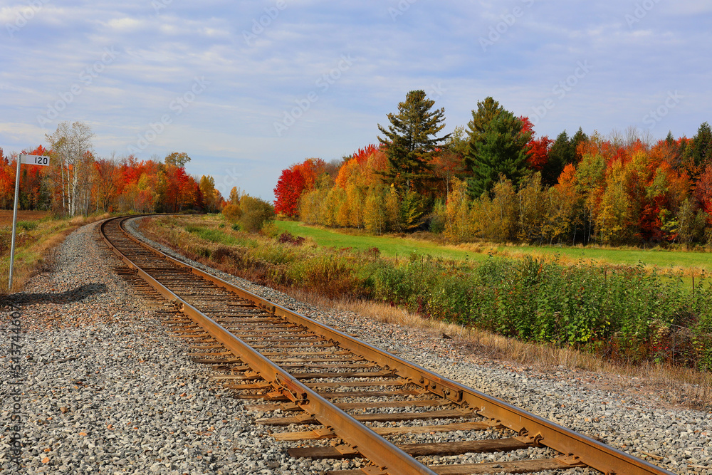 Tracks in fall landscape eastern townships Bromont Quebec province Canada