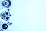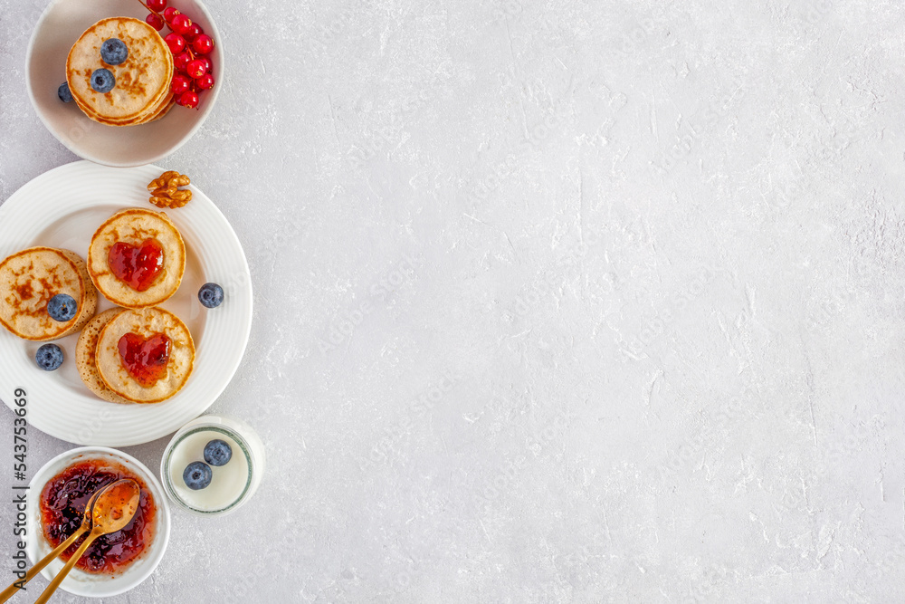 Yogurt and mini pancakes decorated with heart shape jam