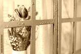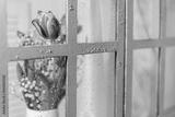 tulips in a white watering can by the window on a white background