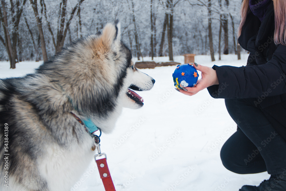A girl plays with a husky with a small blue ball in a snowy meadow on Christmas Day
