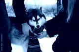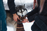 In winter, a couple puts a bright Christmas scarf on a husky dog, the dog is unhappy