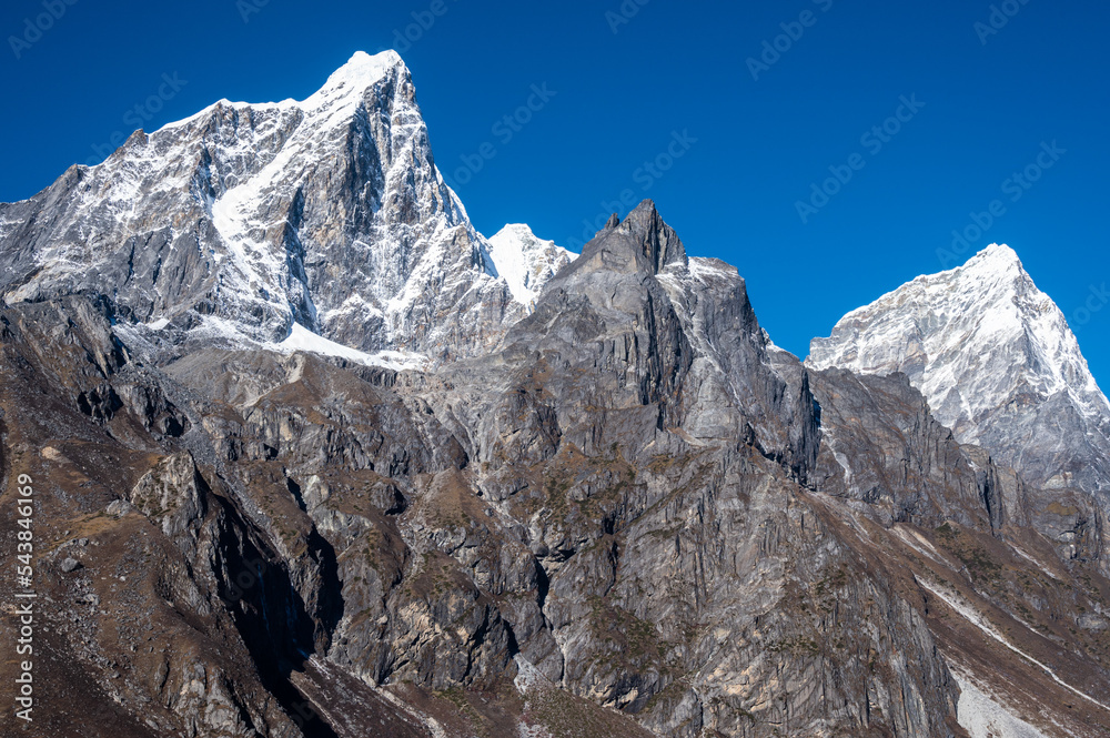 Beautiful view of Mt.Taboche (6495m) and Mt.Cholatse (6440m) on the way to Everest base camp trek in Nepal.