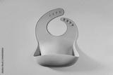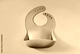 Brown silicone baby bib. First baby accessories for dinner. Top view, flat lay