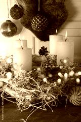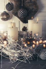 Advent decoration for christmas time. Christmas ornaments with sustainable natural elements. Burnig candles with white twigs and pine cones in front of vintage background.