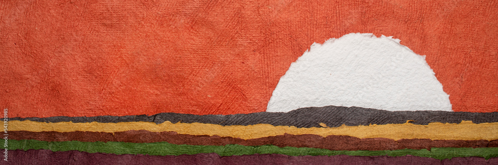 moon or sun rising over abstract colorful landscape, blank circular watercolor paper, panoramic web banner