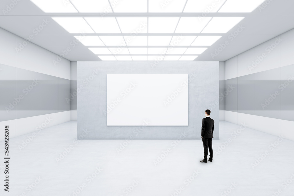 Advertising concept with businessman back view in front of blank white poster with space for your logo or text on light grey concrete partition in abstract empty room, mockup