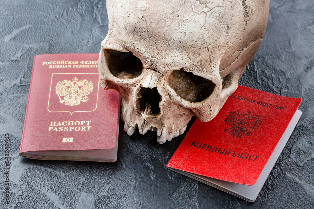 Russian documents passport, military ID and skull on black background. Death war concept. Translation: Russian Federation Military ID