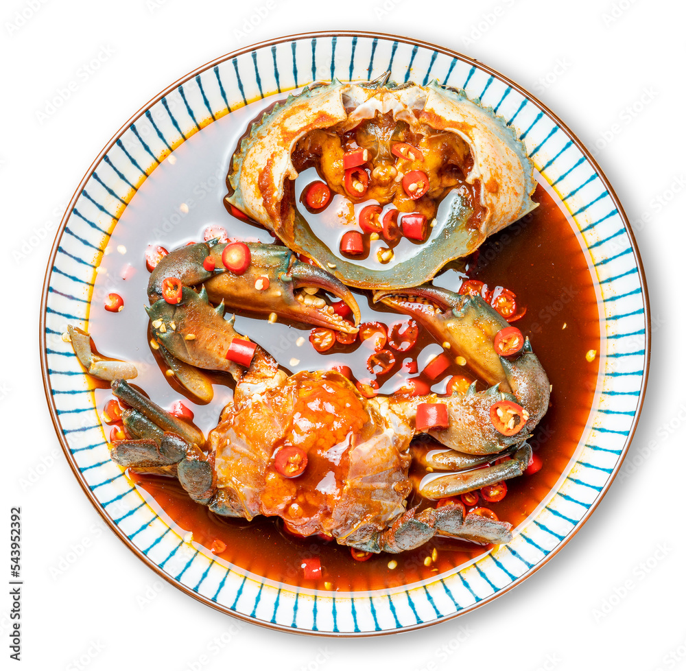 Korean spicy Fresh raw crabs marinated pickled in a mild soy sauce isolated background, Ganjang gejang Korean traditional food on white With work path.