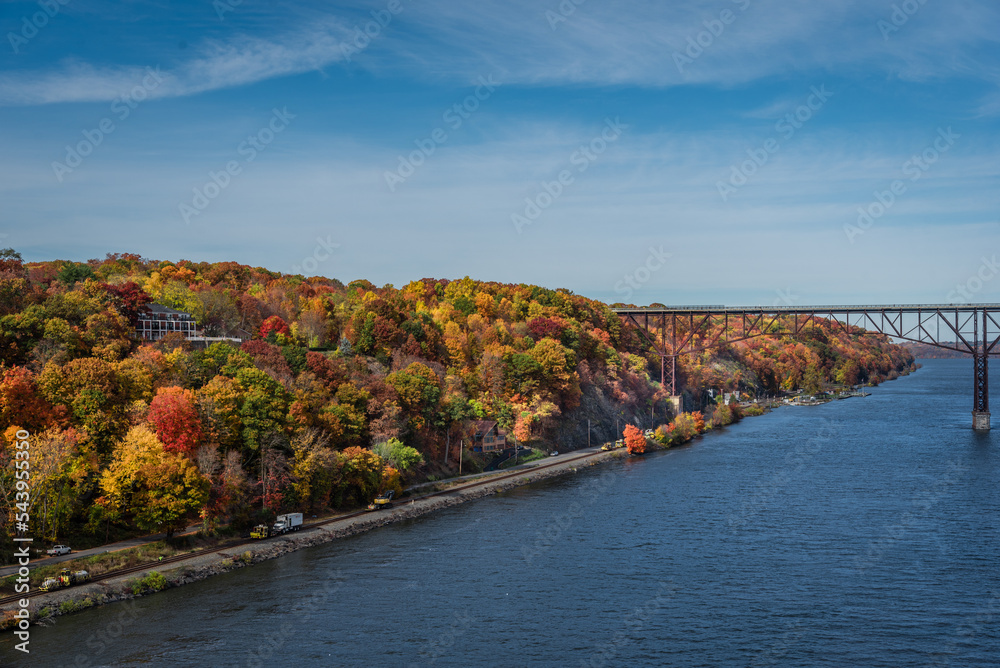 An Autumn view of the Hudson river bank from the mid-Hudson bridge in New York state