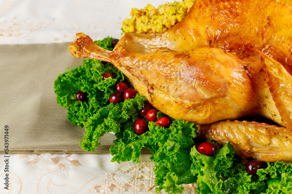 Entire turkey decorated with cranberries and herbs on Thanksgiving Day is delicious meal.