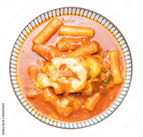 Teokbokki is Korean rice cake stick on white background, Teokbokki with spicy sauce Korean traditional food on whitePNG File.