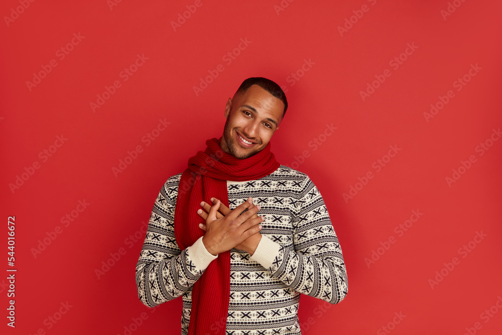 Happy Man Smiling Camera. Cheerful Guy Smiling Sincerely, Holding Hand at Chest, Positive Mood. Indoor Studio Shot, Isolated on Red Background
