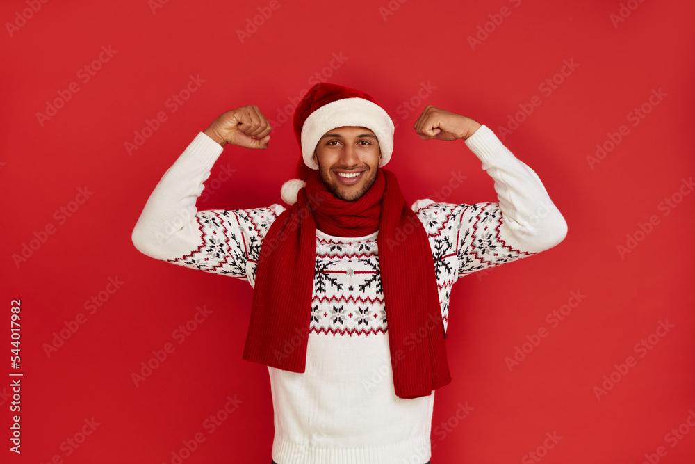 Multiracial Man Showing Biceps. Portrait of Confident Proud Man in Santa Hat Showing Biceps, Feeling Power Success. Indoor Studio Shot Isolated on Red Background