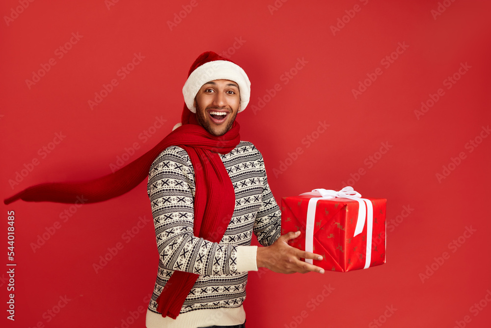 Happy Man Holding Present. Excited Multiracial Guy in Santa Hat Holding in Hands Red Wrapped Present Box with Excitement. Indoor Studio Shot Red Background