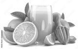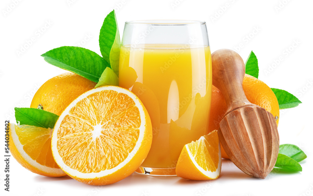 Glass of fresh orange juice and orange fruits isolated on white background.
