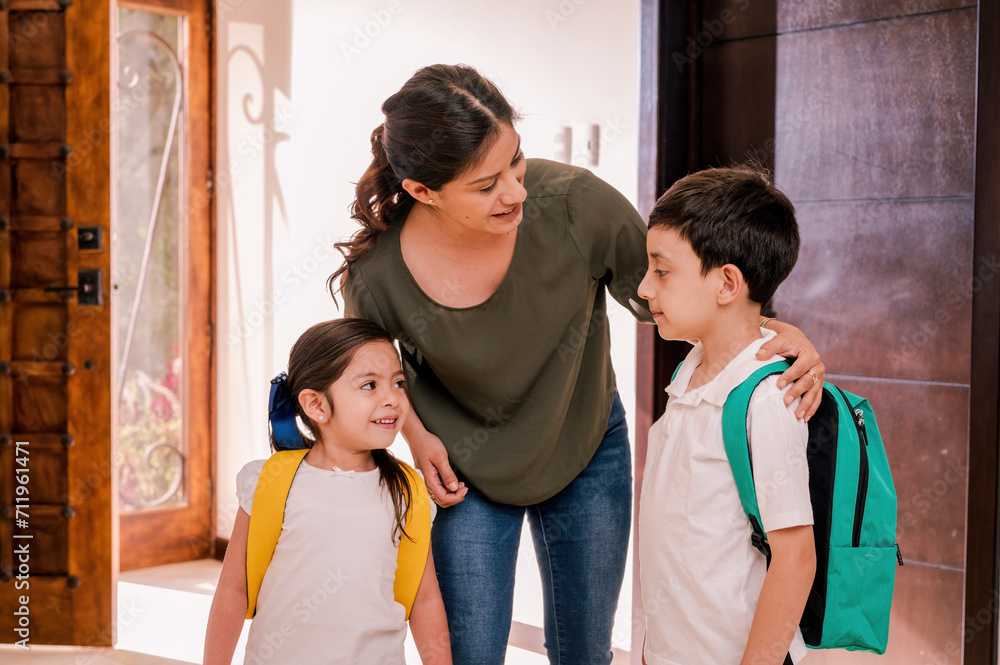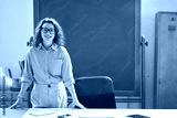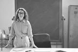 Young happy woman school professional teacher, female instructor coach standing at desk in front of chalkboard in modern classroom working in office presenting business education training, portrait.